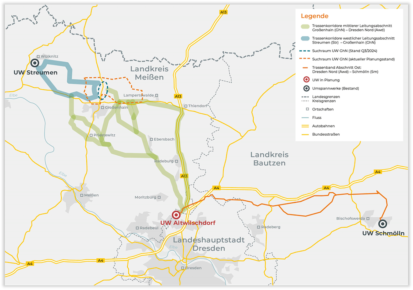 Für den Leitungsabschnitt zwischen Streumen und Großenhain wurde bereits ein Raumordnungsverfahren durchgeführt und mit einer raumordnerischen Beurteilung vom 01/2023 abgeschlossen. Der Beginn des Planfeststellungsverfahrens ist für 2028 geplant.