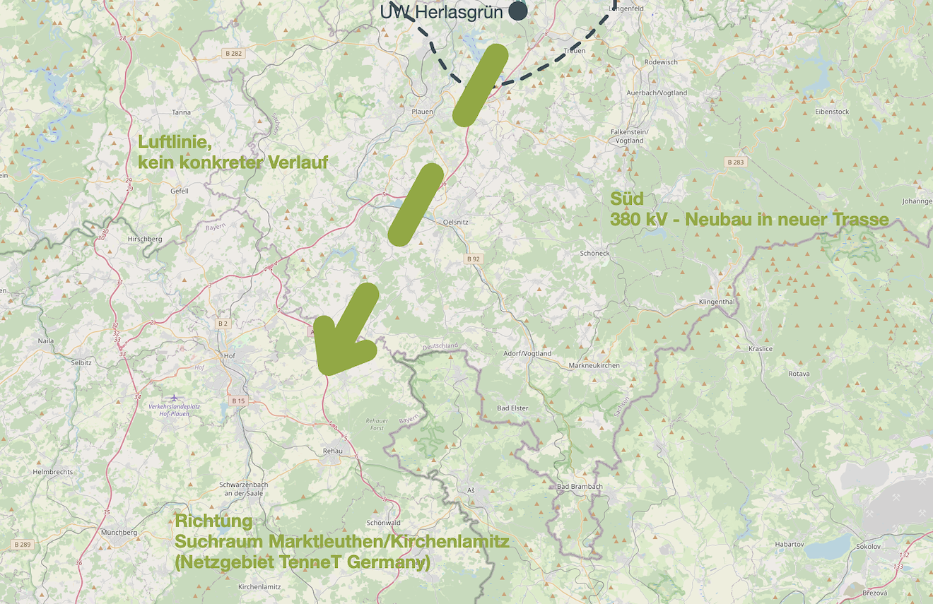 Vom bestehenden UW Herlasgrün bis zum Suchraum Marktleuthen ist ein 380-kV-Neubau in neuer Trasse als Freileitung zu errichten. Die Luftlinie beträgt in der Regelzone von 50Hertz ca. 29 Kilometer, in der Regelzone von TenneT ca. 23 Kilometer. Mit Festlegung des geltenden gesetzlichen Verfahrens beginnt die Ermittlung der Korridorsuche.