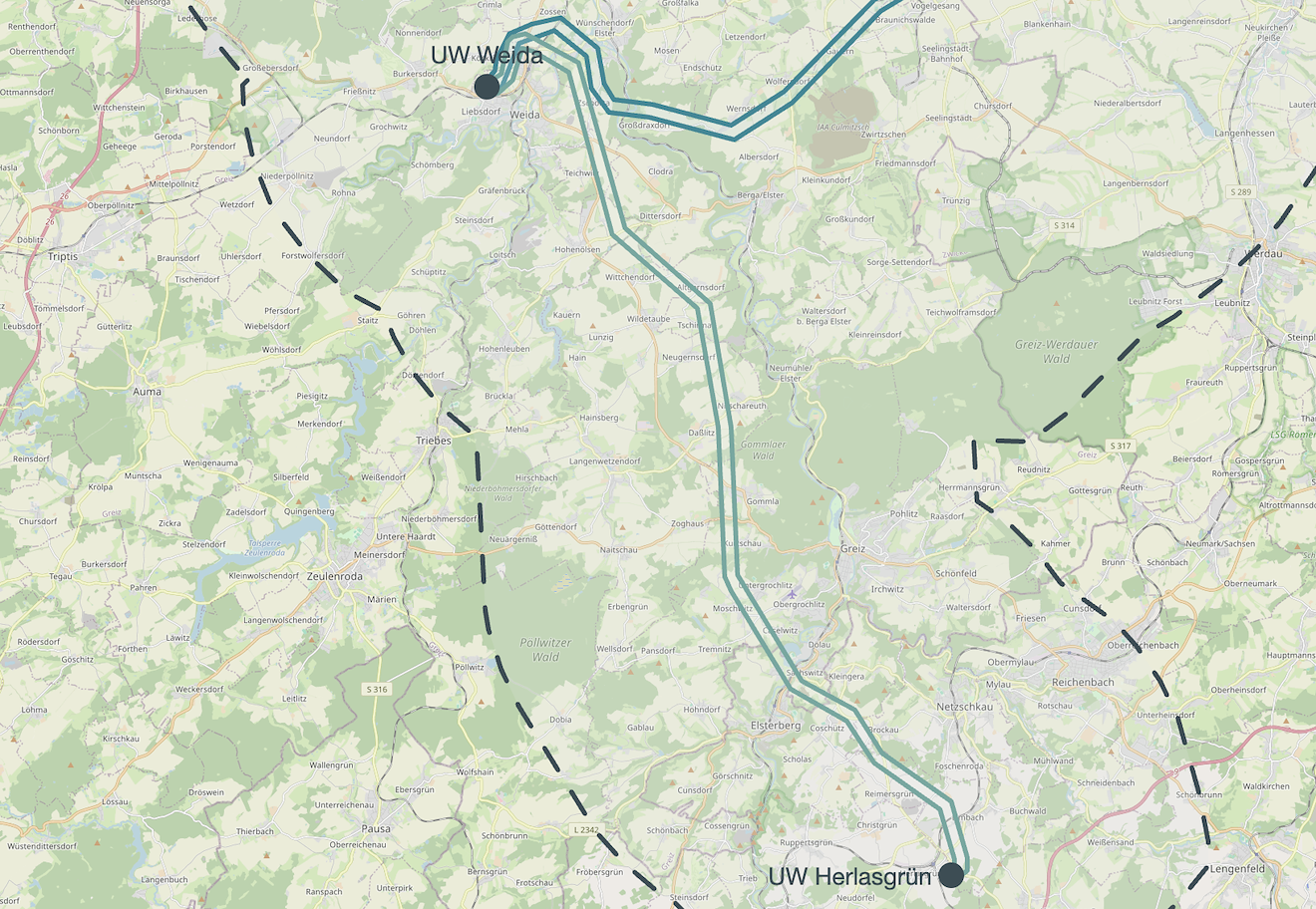 Vom bestehenden UW Weida zum bestehenden UW Herlasgrün ist vorzugsweise im bestehenden 220-kV-Trassenraum ebenfalls eine neue 380-kV-Leitung mit Hochstrombeseilung (4.000 A) zu errichten (Netzverstärkung). Bei der Ablösung der bestehenden durch die neue Leitung orientiert sich die Planung auch hier an der Bestandstrasse. 50Hertz plant den Ersatzneubau parallel zum Bestand. Dabei können Abweichungen vom aktuellen Trassenverlauf bei der nachgelagerten Planung entstehen, um Abstände zu Siedlungen zu erhöhen, bestehende Belastungen für den Naturraum zu verringern oder Bündelungen mit linienförmiger Infrastruktur umzusetzen, um unter anderem dem Bündelungsgebot Rechnung zu tragen.
