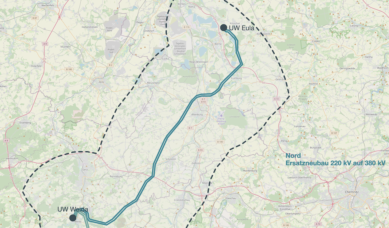Vom bestehenden UW Eula zum bestehenden UW Weida ist vorzugsweise im bestehenden 220-kV-Trassenraum eine neue 380-kV-Leitung mit Hochstrombeseilung (4.000 A) zu errichten (Netzverstärkung). Bei der Ablösung der bestehenden durch die neue Leitung orientiert sich die Planung an der Bestandstrasse. 50Hertz plant den Ersatzneubau parallel zum Bestand. Dabei können Abweichungen vom aktuellen Trassenverlauf bei der nachgelagerten Planung entstehen, um Abstände zu Siedlungen zu erhöhen, bestehende Belastungen für den Naturraum zu verringern oder Bündelungen mit linienförmiger Infrastruktur umzusetzen, um unter anderem dem Bündelungsgebot Rechnung zu tragen.