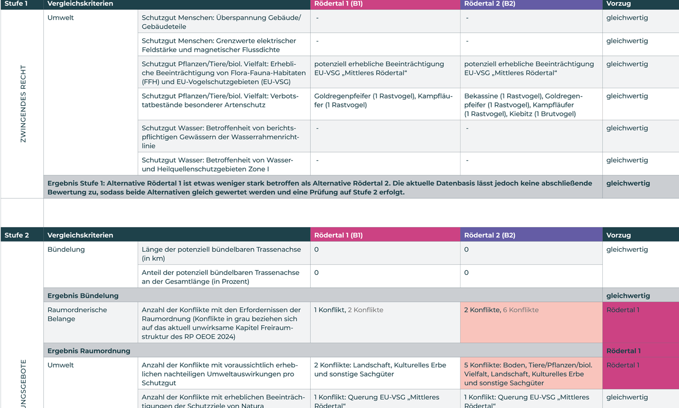 EOL – mittlerer Abschnitt | Vergleichstabellen Korridoralternativen