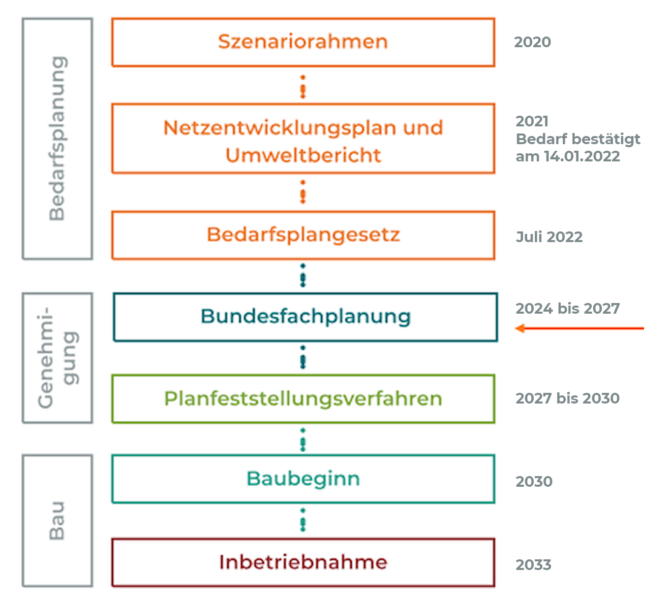Die Bundesnetzagentur bezieht die Öffentlichkeit mit einer Antragskonferenz, dem Anhörungsverfahren und dem Erörterungstermin im Zuge der Bundesfachplanung formal mehrmals in das Genehmigungsverfahren ein. Um über alle Maßnahmen der frühen Öffentlichkeitsbeteiligung von 50Hertz und der formellen Beteiligung der BNetzA rechtzeitig informiert zu werden, melden Sie sich bitte bei unserem Newsletter an.